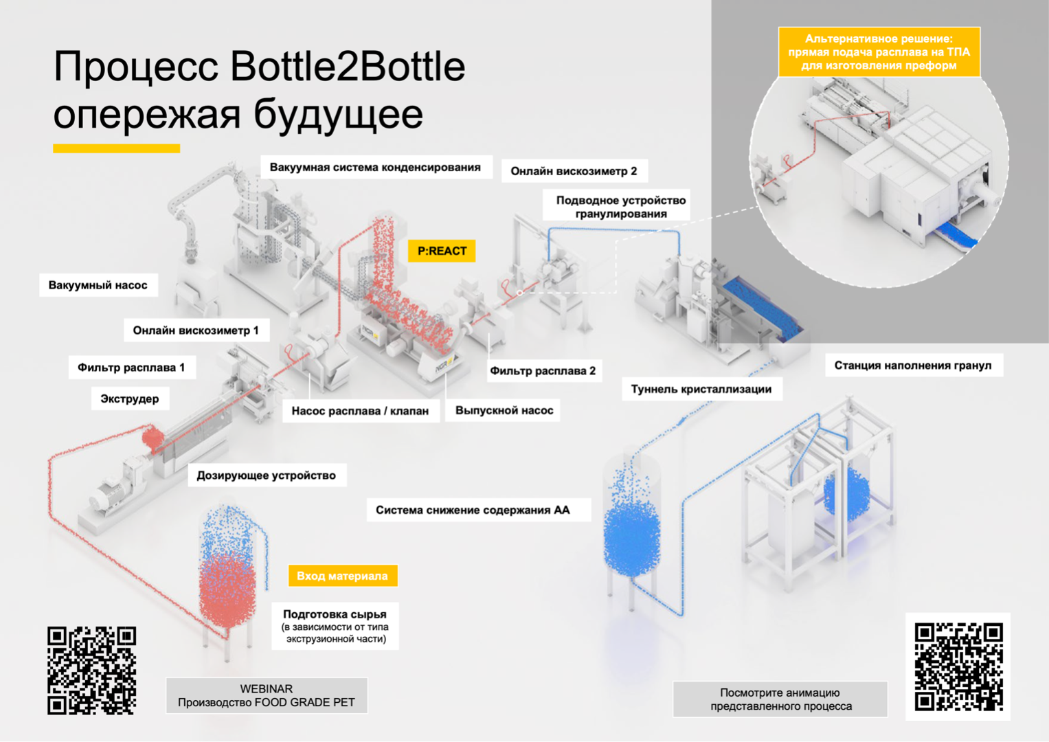 Процесс поликонденсации ПЭТ в жидкой фазе (расплав) обеспечивает высокую скорость поликонденсации, в сравнение с технологией твёрдофазной поликонденсации, также как контроль значения вязкости расплава с высокой точность, а при необходимости, значение IV (характеристическая вязкость) конечного материала может быть выше, чем у исходного материала, в зависимости от Ваших целей и проекта.